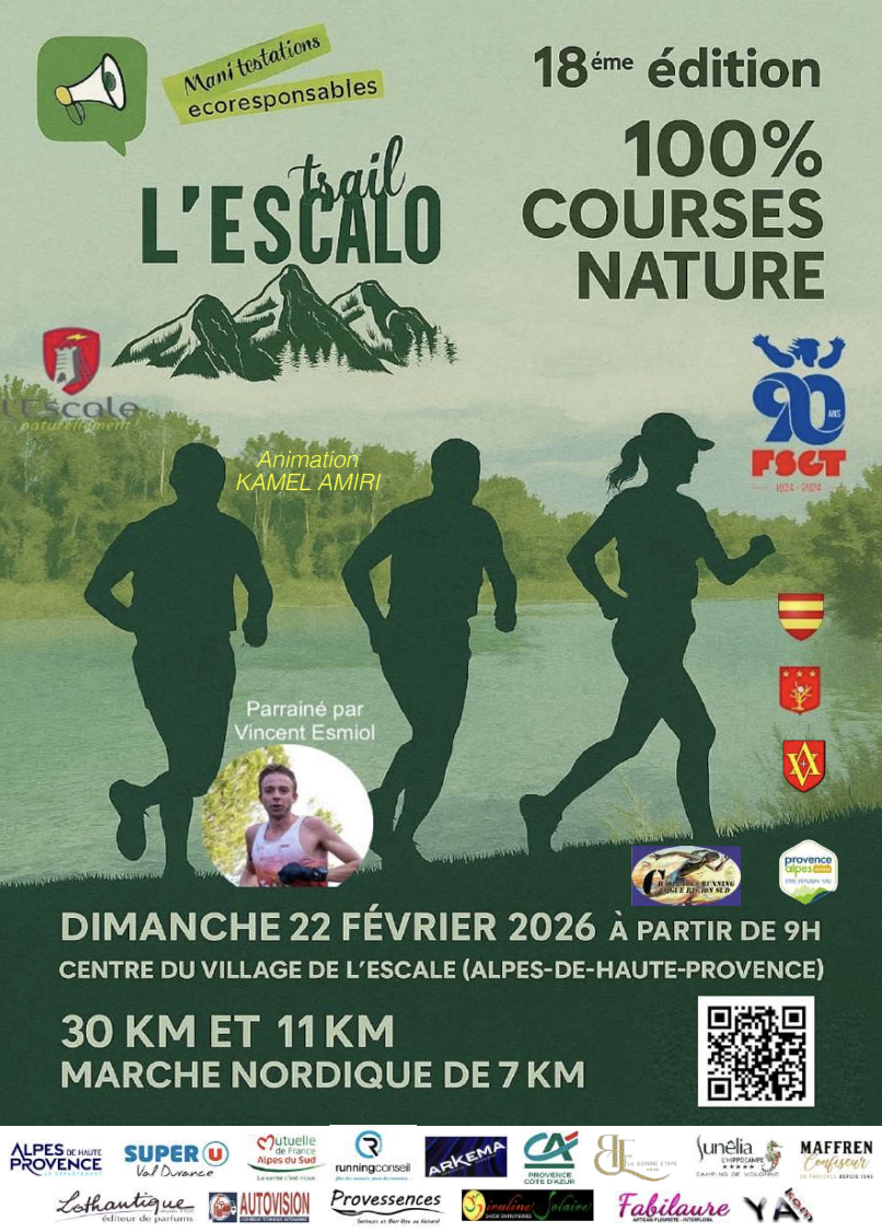 Art.1 : Organisation : Déclic04 organise le dimanche 22 février 2026 la 18ème édition du Trail de l’Escalo sur la commune de l’Escale – 04160. Epreuve individuelle de course de montagne ouvert à toutes et à tous (licenciés et non licenciés). Deux circuits courses de 11km et 30km plus un circuit marche nordique de 7km (non chronométrée). Le 30km fait partie du Super Challenge FSGT et du Challenge des Trail Running 04.