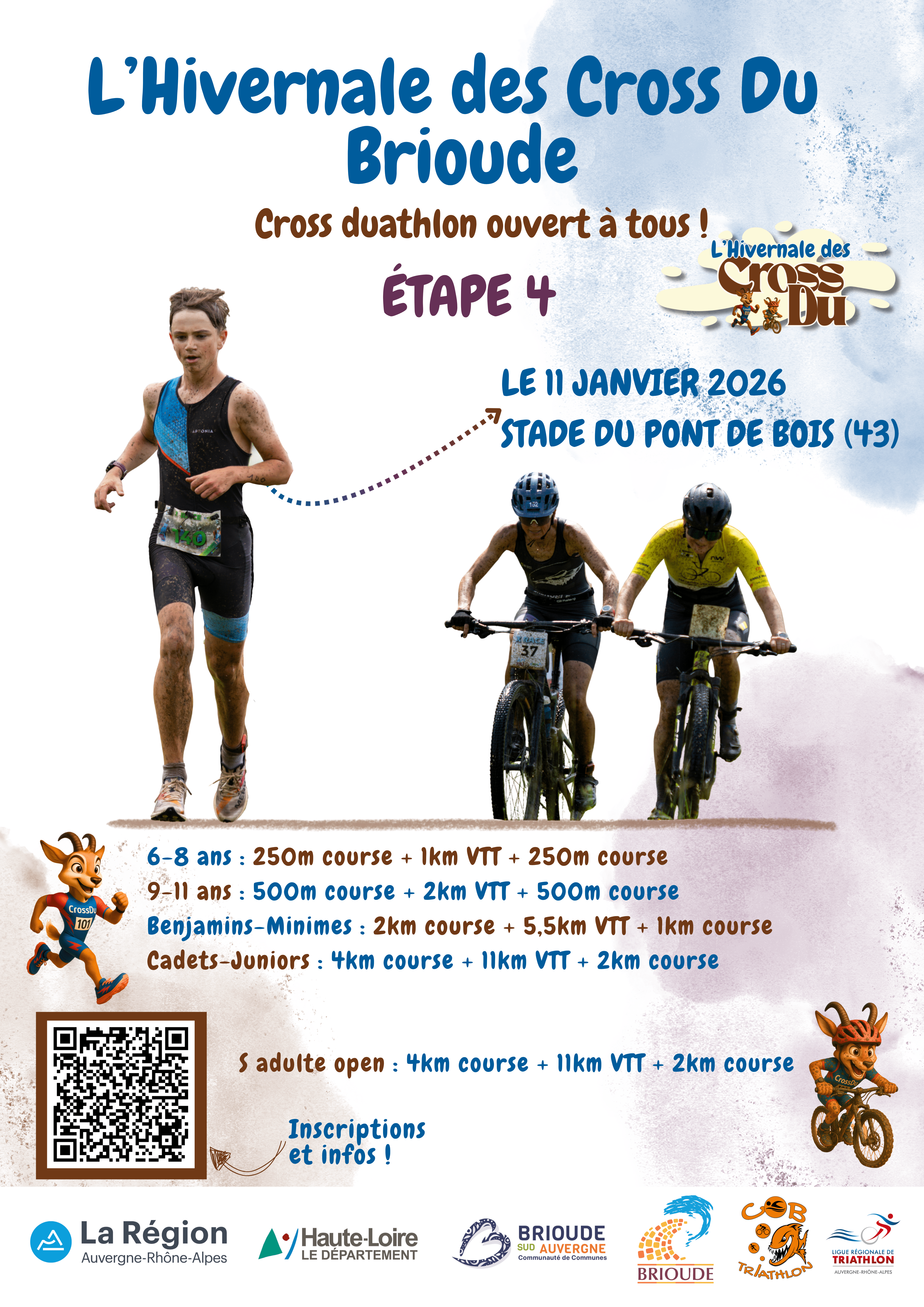 Le C.O.BRIOUDE Triathlon, organise un Cross Duathlon le 11 janvier 2026 au stade du pont de bois à Brioude (43).