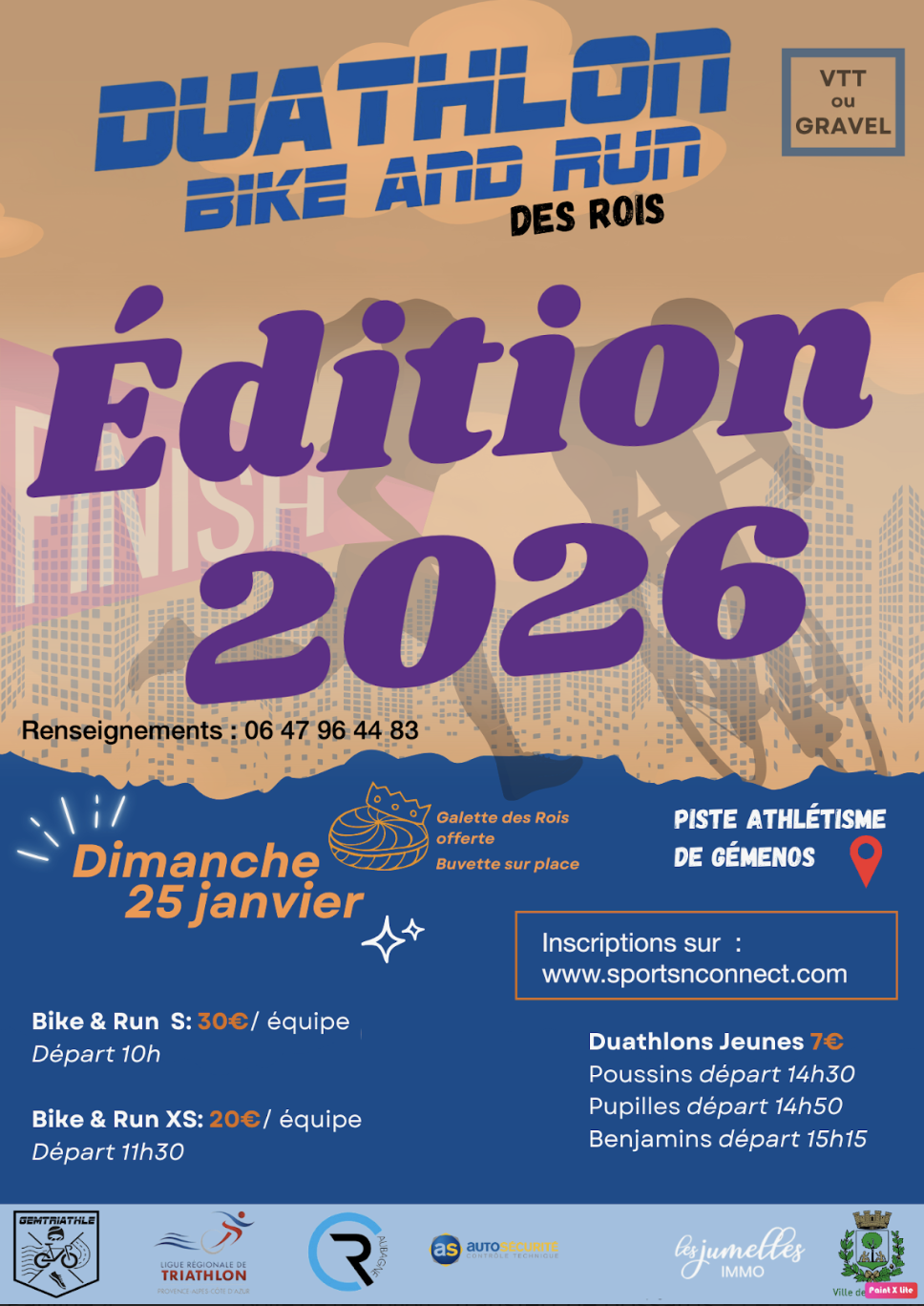 Participez au Duathlon des Rois, un événement convivial et accessible pour les jeunes athlètes. Les épreuves, qui allient course à pied et cyclisme (en VTT), se déroulent par catégories d'âge :